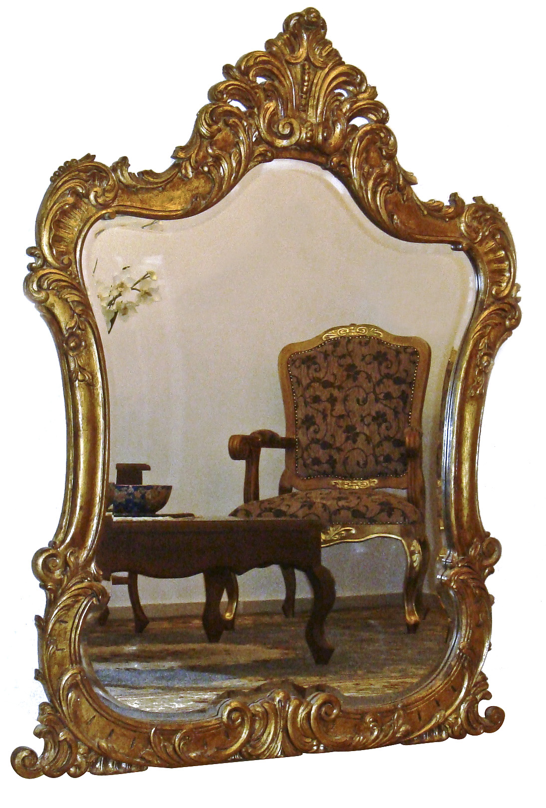 Espelho com moldura em madeira entalhada a mão em tons dourados.