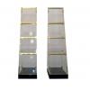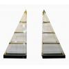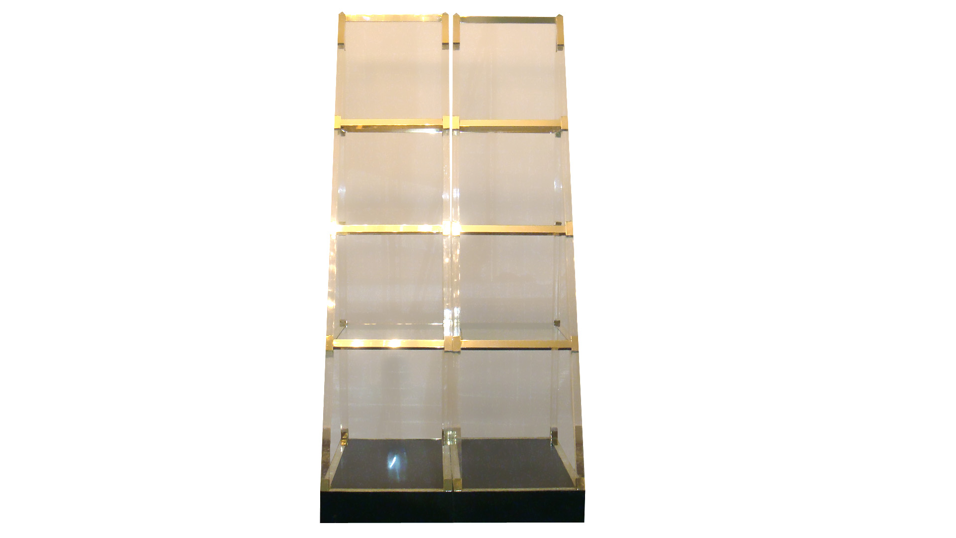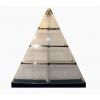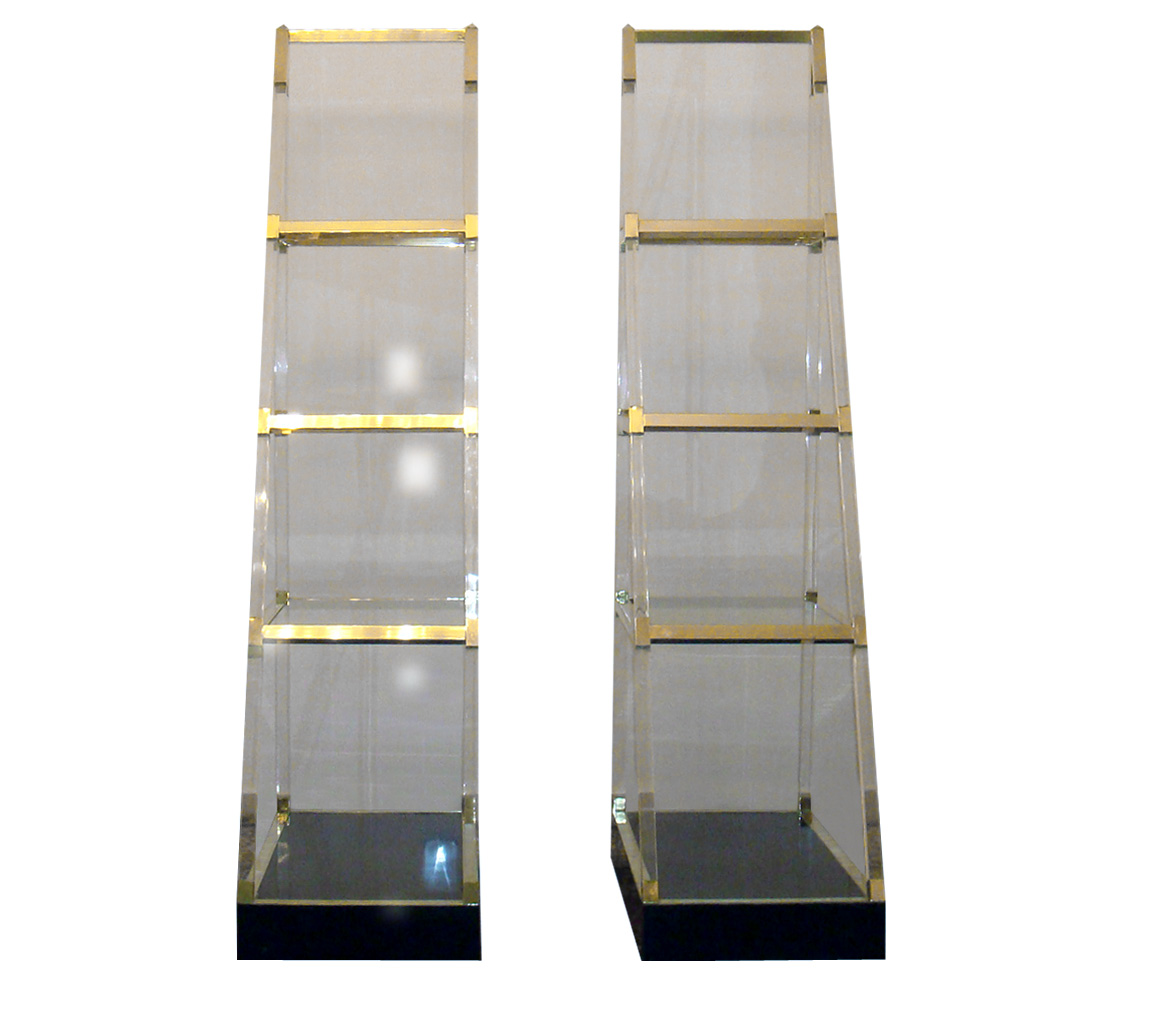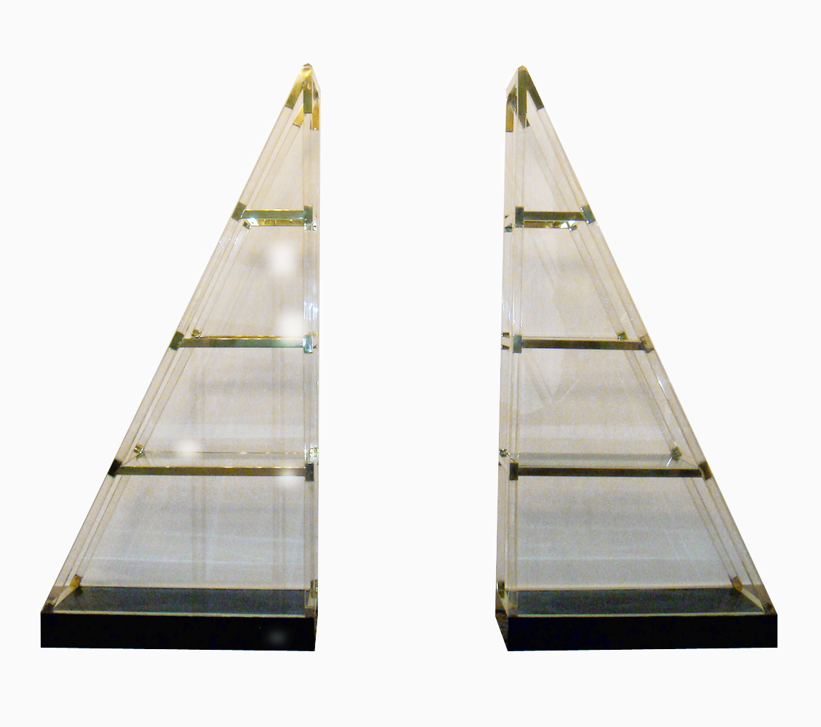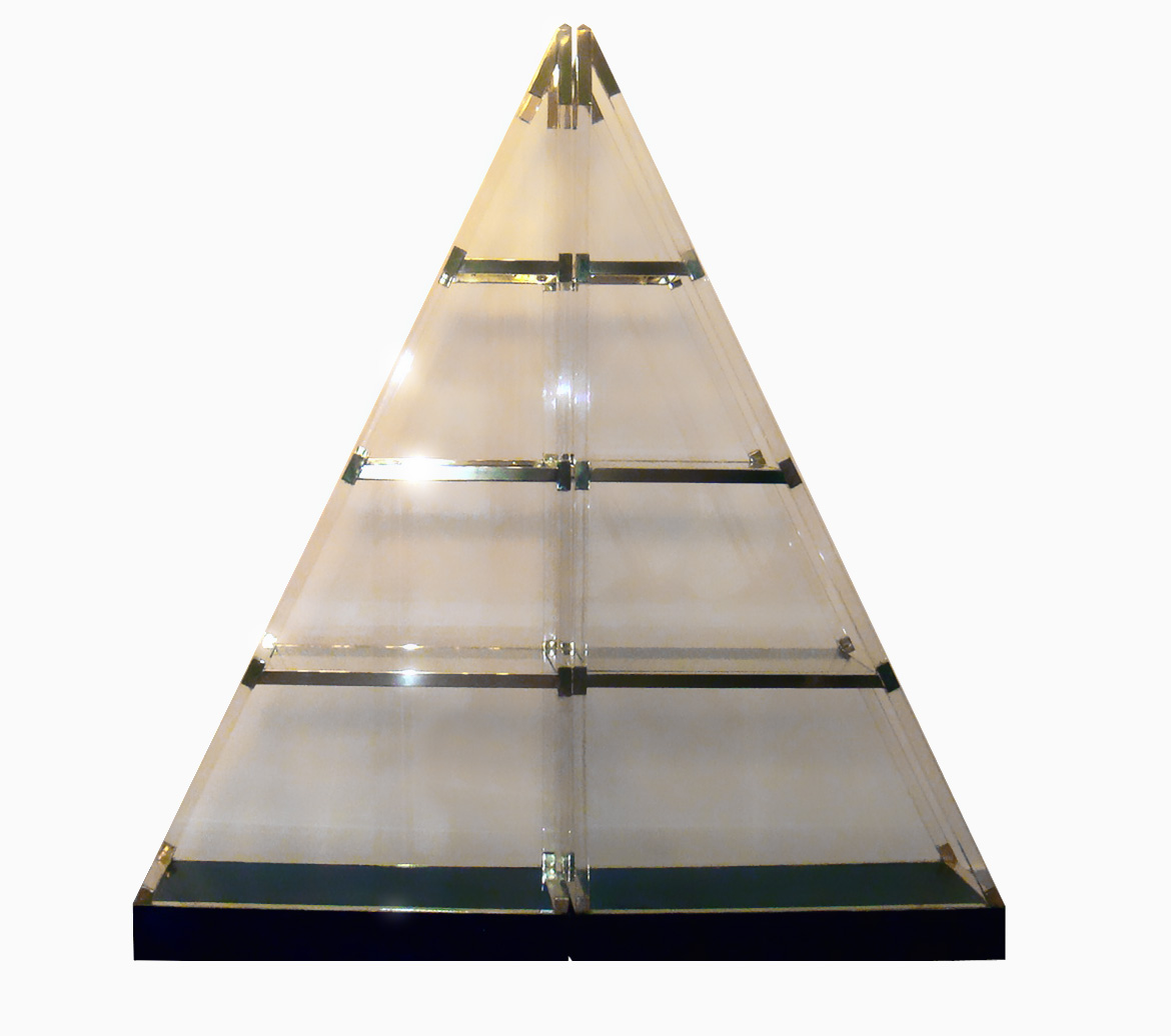 Pirâmide de acrílico com prateleiras de vidro e detalhes em dourado.