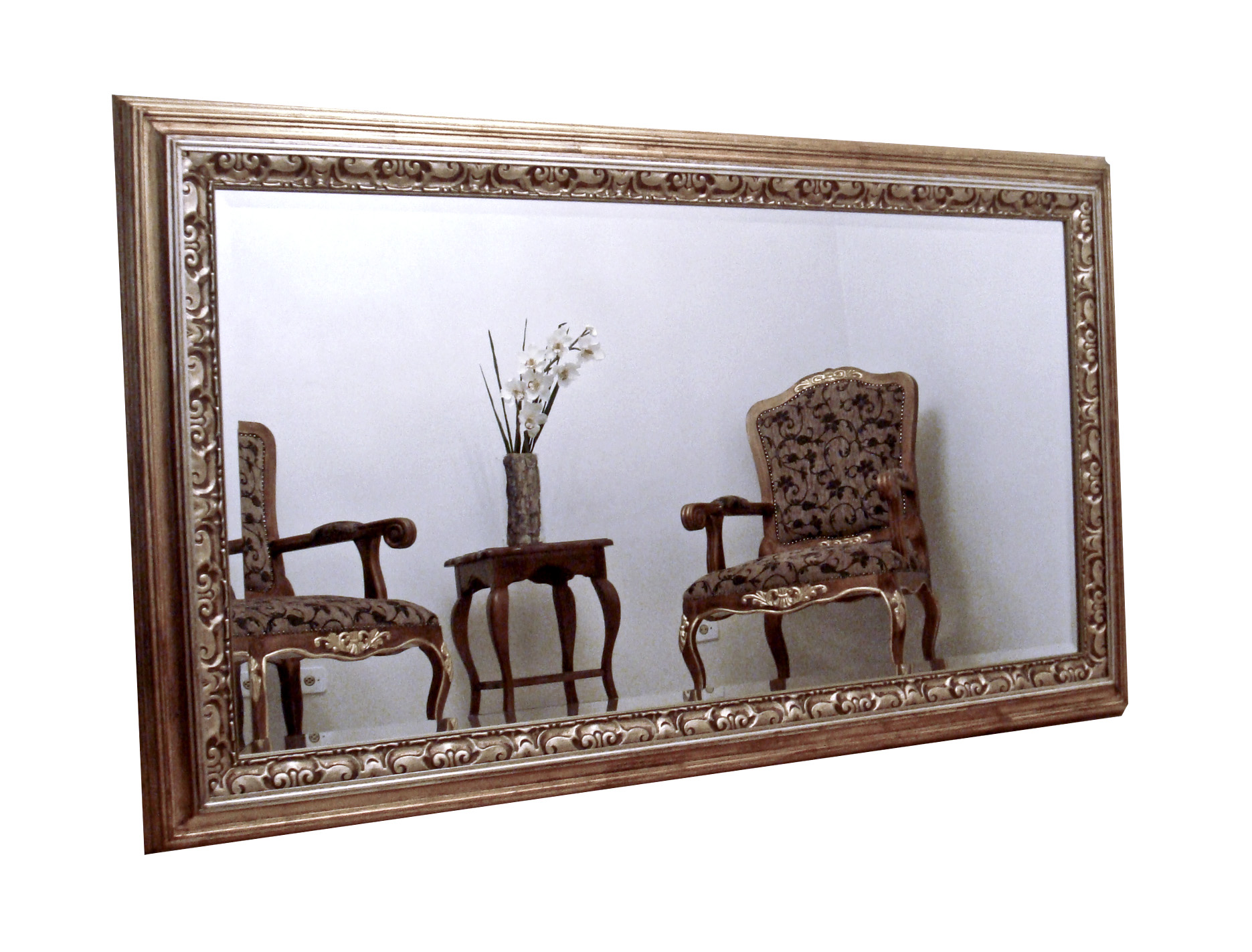 Espelho com moldura clássica em tom dourado envelhecido.